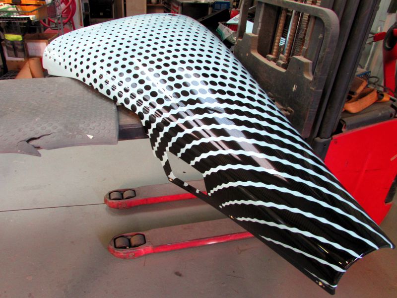 Couleurs bleu ciel clair opaque avec de la décoration noir et carbone apparente en double vernissage, finition haut de gamme.